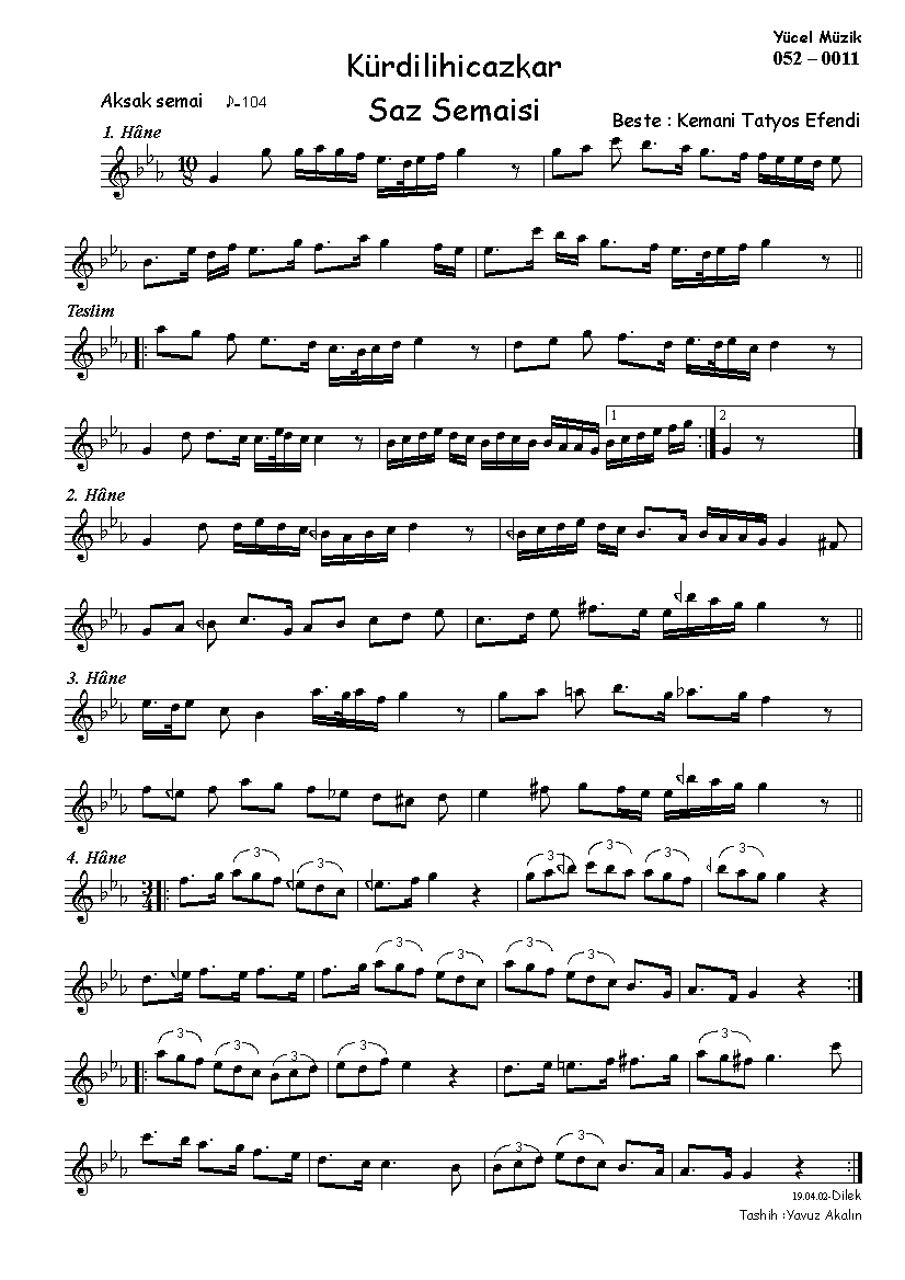 Kemani Tatyos Efendi    1855-1913 Kürdîlihicâzkâr Saz Semâî Aksak semâî . smaller | larger