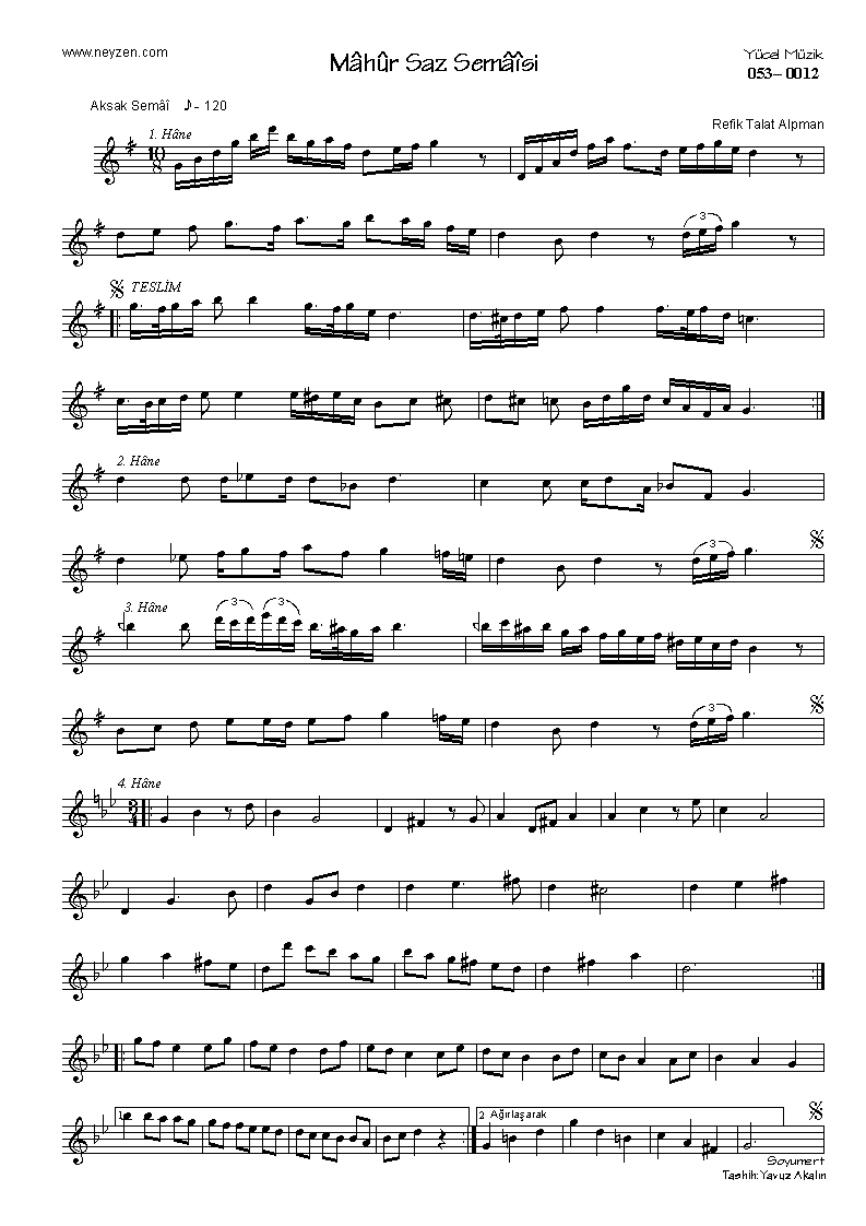 Refik Talat Alpman    1894-1947 Mâhûr Saz Semâî Aksak semâî . smaller | larger