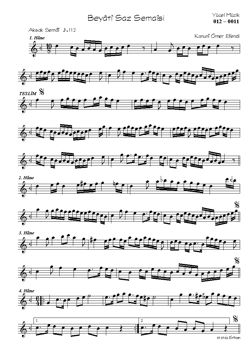 Kanuni Ömer Efendi    ?-1870 Beyâtî Saz Semâî Aksak semâî . smaller | larger