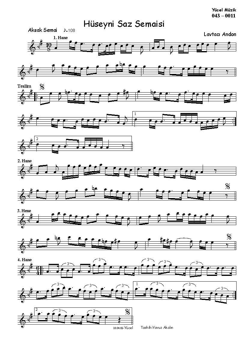 Lavtacı Andon    ?-1915? Hüseynî Saz Semâî Aksak semâî . smaller | larger